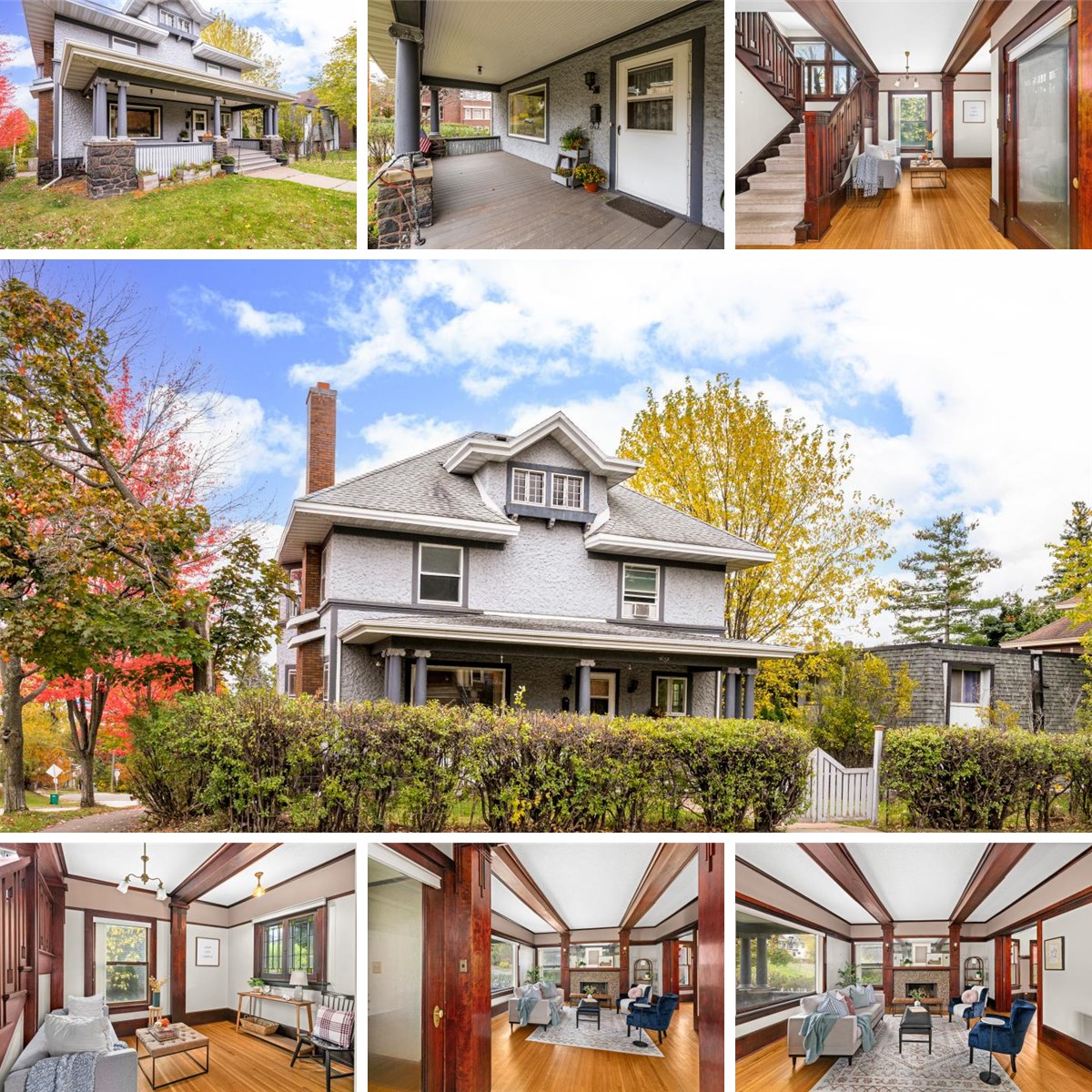 Spectacular American Four Square home full of charm, character, and incredible craftsmanship! This historic gem boasts hand-carved porch pillars, ornate mahogany woodwork, beamed ceilings, beautiful hardwood floors, and a second-floor deck with views of Lake Superior. Step into the main floor parlor/sitting room and flow into a spacious living room featuring a handsome decorative fireplace and a large picture window that lets in tons of natural light. The formal dining room showcases the original built-in buffet and offers ample space for hosting dinners. The large kitchen includes a bright breakfast nook and a perfect blend of original and updated cabinetry. A stunning open hand-carved stairway leads you to the second floor, where you’ll find four generously sized bedrooms and a full bath with a tiled tub surround. The third floor adds even more space with a 5th bedroom, cozy sitting room with views, and a full bath with a clawfoot tub. Located on a corner lot with a newer 2-car garage, 1-car tuck under, and newer boiler. A truly special home that’s both welcoming and rich in architectural history—don’t miss your chance to make ityours!
