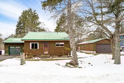 Nestled on a beautiful 2-acre lot, this spacious ranch-style home offers the perfect blend of comfort, functionality, and outdoor space. The main floor features a bright and airy living room with a pass-through to the kitchen, which boasts black painted cabinetry, a center island, a gas stove, and a window overlooking the backyard and beautiful sweeping pines.The formal dining area can also be closed off and used as a bedroom, with a door leading out to the large back deck — perfect for entertaining. The main floor also includes an additional bedroom and a full bath, along with an upper-level expansion room that can serve as a bedroom, office, or rec space. The lower level offers a rec room, a bedroom with tiled flooring, a ¾ bath, a storage room, and a laundry/utility area. There is a 1-car heated attached garage, plus an impressive 24x40 detached garage/shop, ideal for projects, hobbies, or extra storage. Additional features include ample outdoor parking for boats and RVs, a storage shed, new gutters, and a scenic backyard setting with tall pines and a pond that attracts wildlife — a rare find for an in-town property. Conveniently located nearProctor amenities and schools, schedule your showing today before this gem is gone!